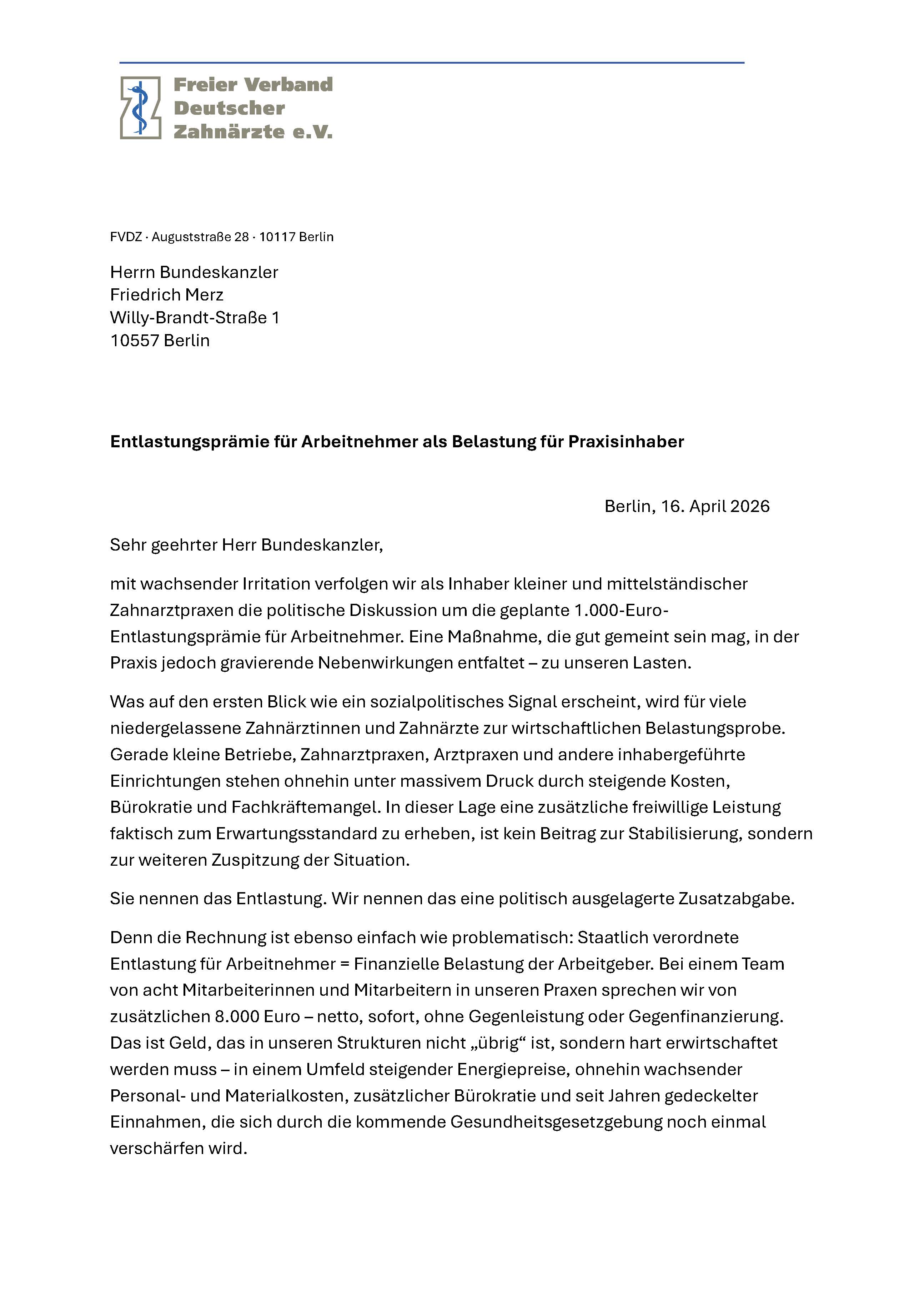 Es wirkt fast wie eine Laune des Bundeskanzlers und seines Koalitionsausschusses, deren Folgen allerdings nicht bedacht wurden. 1.000 Euro „Entlastungsprämie“ sollten Arbeitnehmer bekommen können wegen der finanziellen Mehrbelastungen, die durch den Krieg im Iran vor allem an den Zapfsäulen und im Supermarkt entstehen. So war es Anfang vergangener Woche überall zu lesen. Inzwischen ist klar: Die Entlastungsprämie sollen die Arbeitgeber ihren Mitarbeiterinnen und Mitarbeitern gewähren – freiwillig, ganz ohne Zwang. Dass dies nicht so einfach ist, gerade in der derzeitigen wirtschaftlichen Situation, die sich für viele auch noch weiter verschärfen wird, wurde von der Bundesregierung offenbar nicht bedacht. Und so meldeten sich im Laufe der Woche viele kleinere und mittlere Unternehmen zu Wort, die bereits kundtaten, die Prämie nicht zahlen zu können. Die Idee der Bundesregierung kommt für viele zur Unzeit und hat sie kalt erwischt. Der Freie Verband Deutscher Zahnärzte (FVDZ) hat einen offenen Brief an Bundeskanzler Friedrich Merz geschrieben, in dem er darauf hinweist, dass die Entlastungsprämie für Arbeitnehmer für die Arbeitgeber zu einer „politisch ausgelagerten Zusatzabgabe“ werde. Der Erwartungshaltung der Mitarbeiterinnen und Mitarbeiter könnten die meisten inhabergeführten Praxen nicht standhalten. Die Prämie werde nicht als freiwillige Leistung wahrgenommen, sondern als neuer Standard. Dies schaffe noch mehr Druck in den Praxen und fördere sogar die Abwanderung von Personal aus den Praxen. Hier geht’s zum offenen Brief.